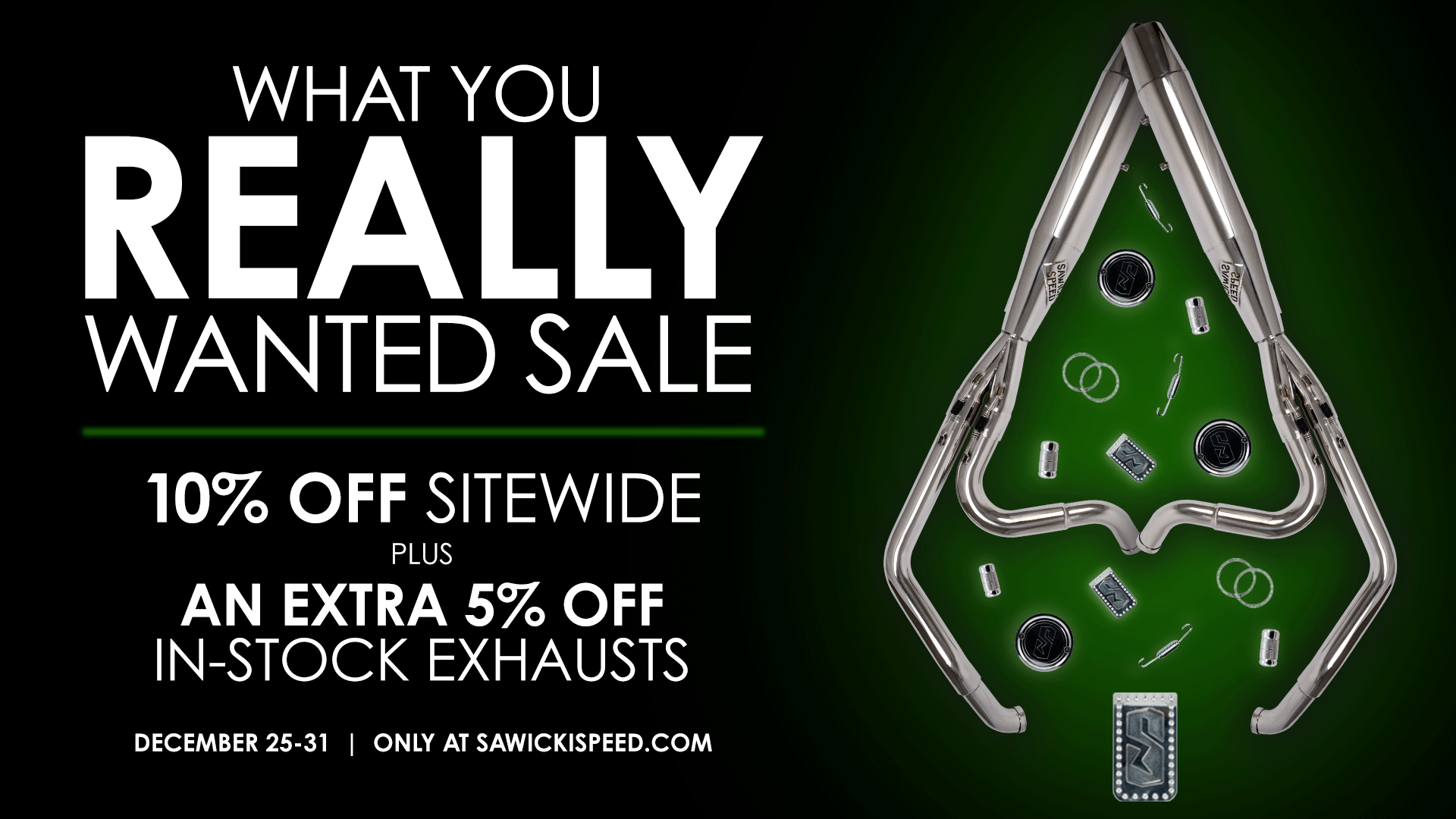Standard lead times apply for backorder items; in-stock items ship within one week. Extra 5% on in-stock exhausts subject to availability, while supplies last. Sale runs Dec 25-31 2025. Valid at www.sawickispeed.com Cannot be combined with any other discounts or offers. Not retroactive.